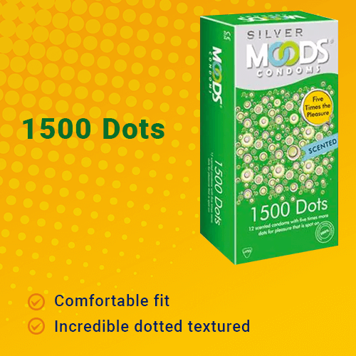 Moods Silver series brings in the Moods 1500 Dots! Moods silver 1500 dotted condoms are made using the natural rubber latex and each condom contains perfect lubricant ata reservoir tip which gives you maximum pleasure. This green colourMoods Dotted Condoms are dermatologically and electronically tested for the reliable quality.Five times the usual number of dots means five times theextra pleasure that is spot on. This is definitely an offer that you can’t refuse. With 12 scented condoms in a pack, Moods extra dotted condoms are bound to give you the out of the world experience. Treasure the pleasure with the Moods 1500 Dots Condoms.